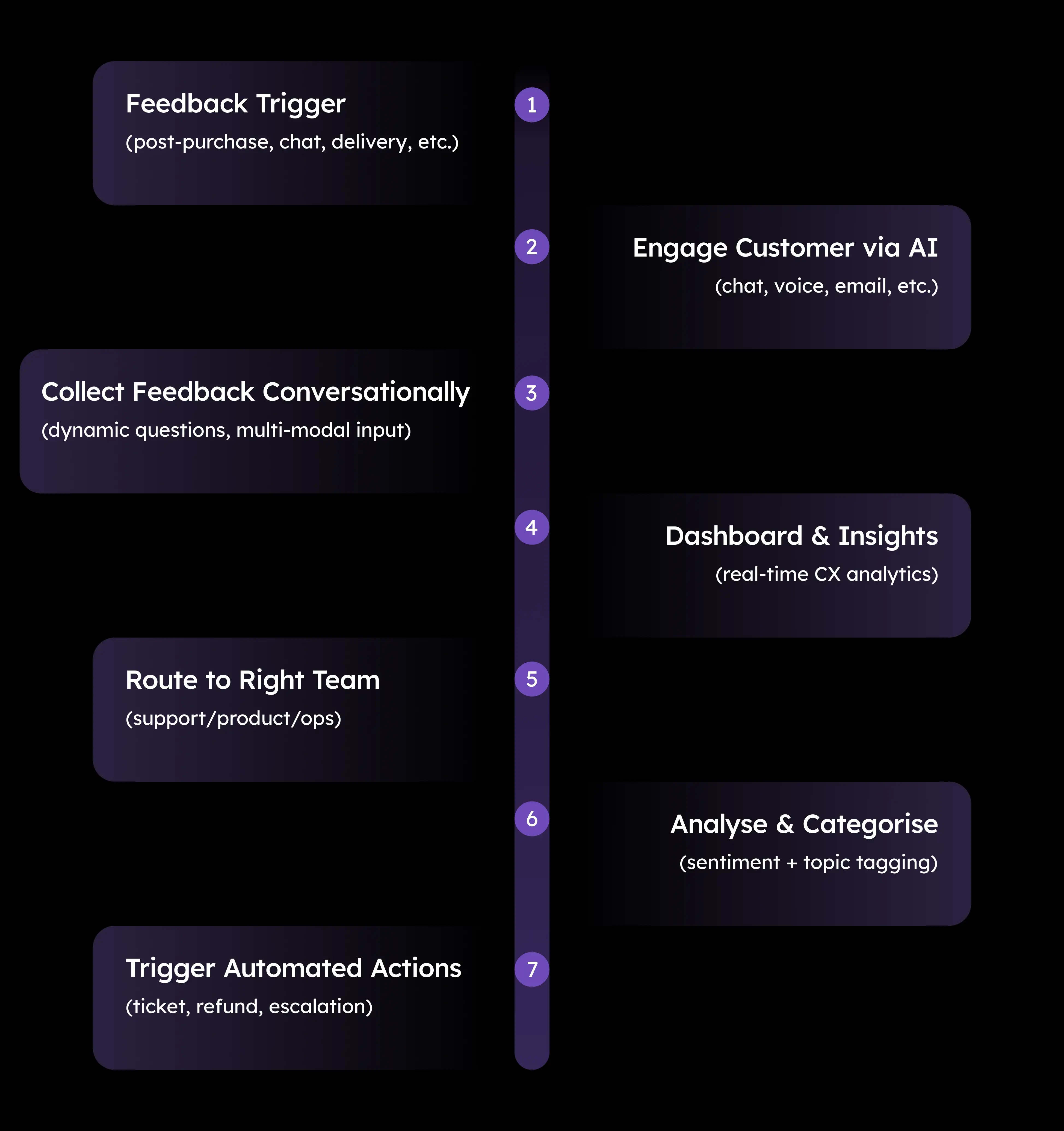 Feedback Collection AI Agents shift this entirely. They engage customers at high-impact moments across the journey - when an order is delivered, when a support interaction ends, when a payment fails, when a subscription changes, or when someone quietly drops off mid-flow. Instead of relying on delayed recollections, the AI agent captures reactions while they are fresh, detailed, and emotionally accurate.